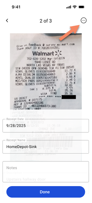 Within the receipt viewing screen, you will find a dedicated Edit option (3 dots in the upper right corner) that allows you to modify the name, description, and date.