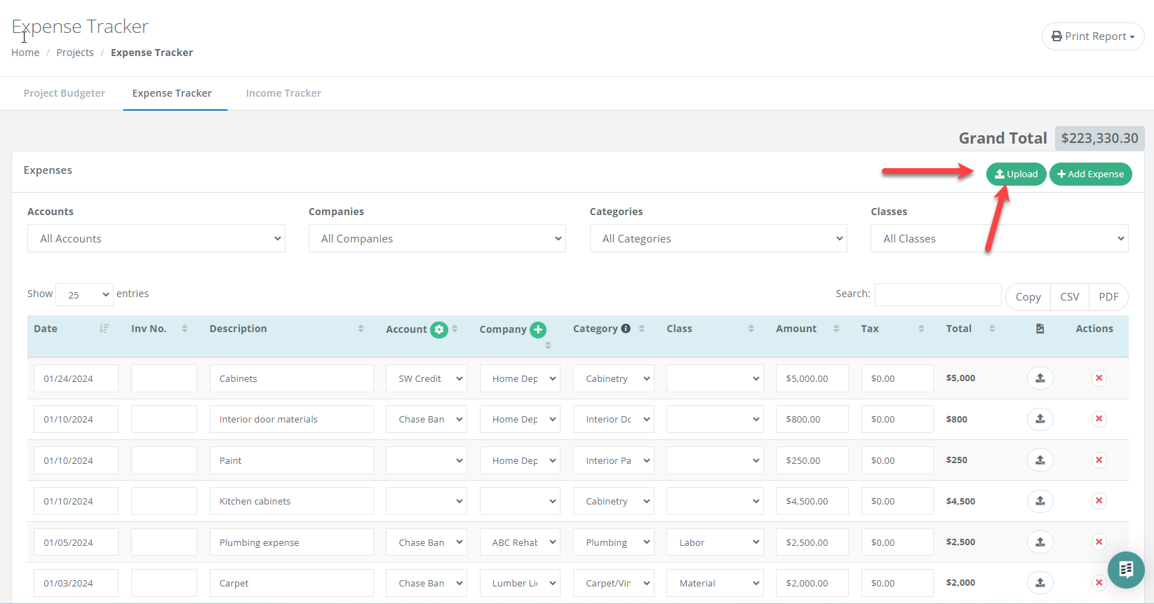 Use the Upload button in the top right of the Expense Tracker to bulk import transactions. This tool is designed to quickly sync data from your bank accounts, credit cards, or accounting software.