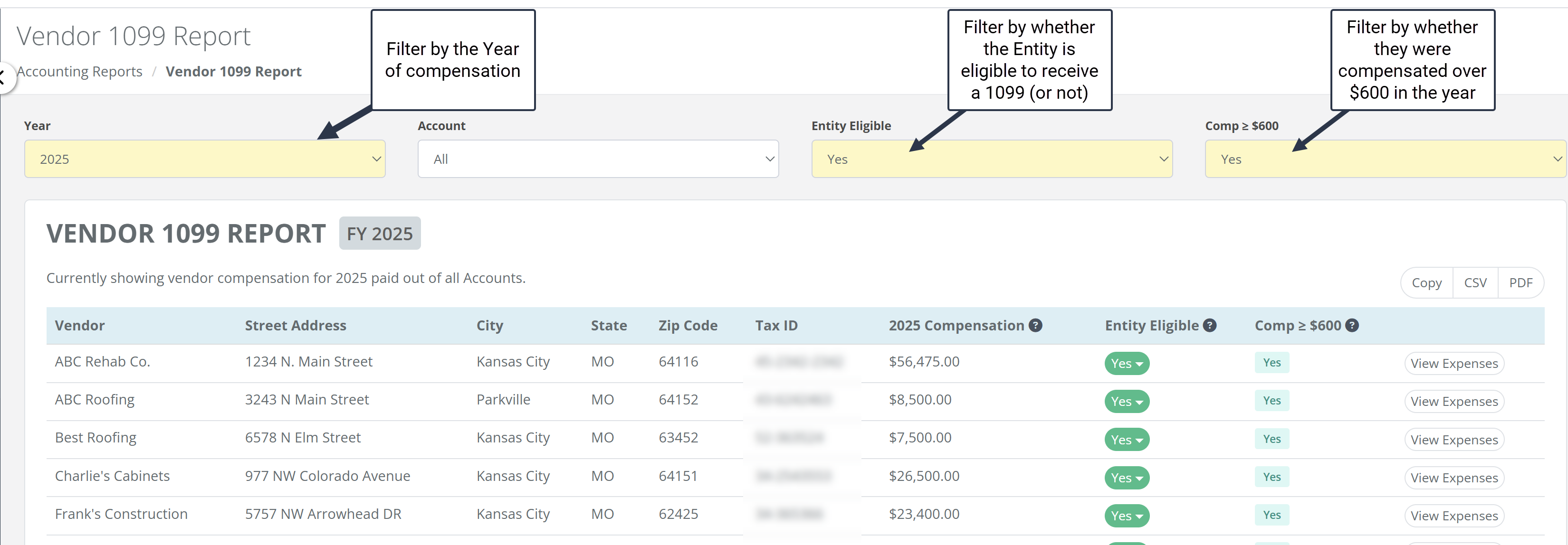 We believe in "trust, but verify." If a total looks higher or lower than you expected, click the View Expenses link next to the vendor's name. This will open a detailed breakdown showing every specific expense, project name, and date that makes up that vendor's total compensation for the year.